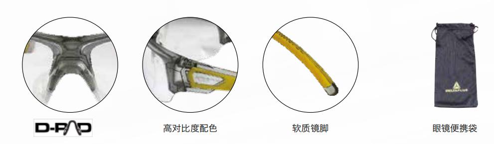 運動款PC防護眼鏡,PC/TPR復合雙材料鏡腿,黃黑高對比度炫酷配色,“D-PAD”獨特創新鼻梁架,高度貼合面部自由調節高度,可適用于任何臉型。隨眼鏡附贈便攜袋一個。