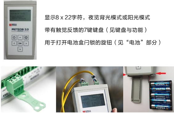 內置電池(5 x AA)可為METEON 2.0和相連的智能型輻射表供電,還可連接外部直流電源。M&T溫度傳感器必須與外部(12VDC)直流電源一起使用。METEON 2.0可以測量、顯示和記錄多達8個設備的數據。根據連接的儀器數量和選擇的記錄間隔,它可以存儲數周的數據。