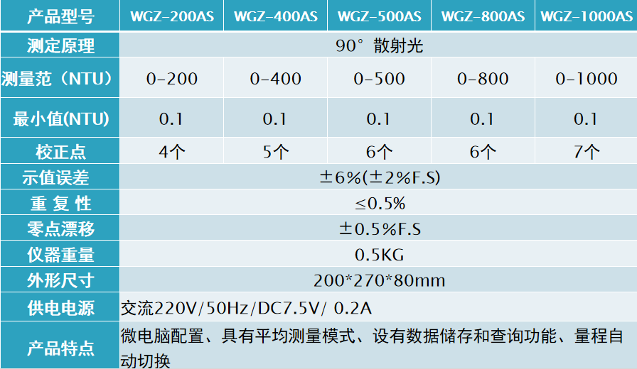 齊威 WGZ-AS系列微機型濁度儀 產品參數:
