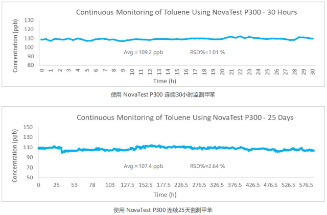 NovaTest P300采用世界領先的美國微流專*技術、MEMS設計, 峰形好、半峰寬窄,相比于傳統(tǒng)GC大大縮短了分析時間。同 時,P300支持連續(xù)測試,客戶可根據應用需求設定任意測試頻率,連續(xù)監(jiān)測分析VOC混合物。下列結果為30小時和25天對甲苯的 連續(xù)測試數據,每30分鐘進行一次測試。