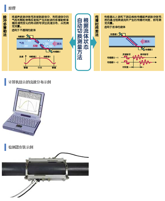 新式脈沖多普勒法與傳播時(shí)間差法并用的新一代混合型超聲波流量計(jì)(非接觸式測(cè)量)能根據(jù)流體狀態(tài)自動(dòng)切換進(jìn)行測(cè)量。