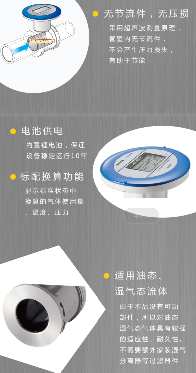 采用超聲波時差法準確測量氣體流量,耐腐蝕,穩(wěn)定可靠,精度高廣泛應(yīng)用于各種氣體流量的測量。無節(jié)流件,無壓力損失,可對壓力不到1MPa的空氣進行流量測量。可選擇螺紋式、對夾式法蘭或者是法蘭的連接方式。可提供鋰電池供電無需布線