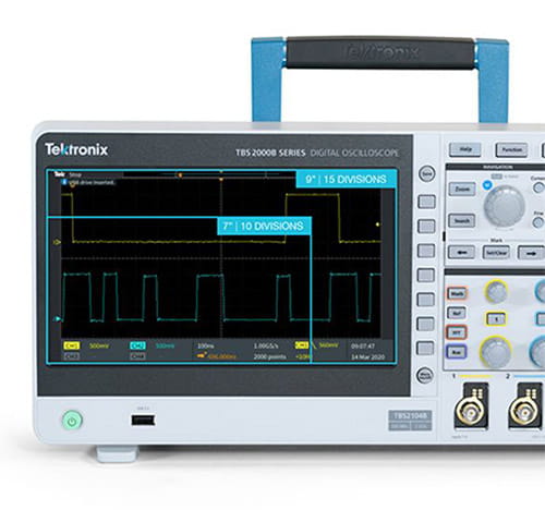 新款 TBS2000B 數字存儲示波器適合查看和測量信號。利用其更大的 9 英寸顯示屏可以查看更多信號,該顯示屏具有 15 個水平格,可提供更長的每屏幕時間以及 5M 記錄長度,從而捕獲長時間窗口。利用易操作的光標和強大的 32 種自動測量功能測量更多信號。利用 Wi-Fi 連接和 100-BaseT 以太網端口共享更多信號。