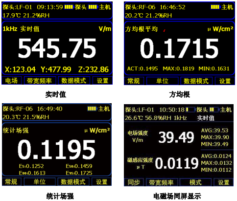 實時值、方均根值、算術平均值、最大值、最小值、統計場強、空間平均、時間曲線、選頻分析等數據模式