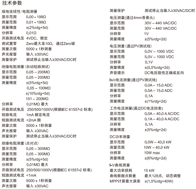 德國(guó)GMC-I高美測(cè)儀電站安規(guī)及IV曲線測(cè)試儀SEAWARD PV200 產(chǎn)品參數(shù):