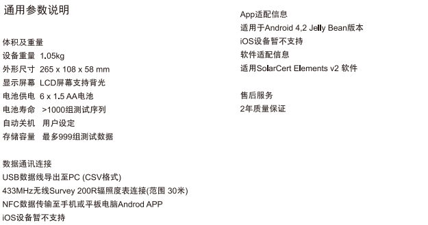 PV200為光伏系統(tǒng)提供了一個(gè)高效率和有效的測(cè)試及診斷解決方案,能夠根據(jù) IEC 62446標(biāo)準(zhǔn)進(jìn)行投運(yùn)試驗(yàn),并且根據(jù)IEC 61829快速,準(zhǔn)確的測(cè)試IV曲線。配合使用Solar Surver 200R輻照度計(jì),PV200能將測(cè)量數(shù)據(jù)轉(zhuǎn)換為STC標(biāo)準(zhǔn)值 ,無論是使用PVMobile或者SolarCert ELements上位機(jī)軟件,均支持與PV組件的出廠標(biāo)定值進(jìn)行直接對(duì)比。