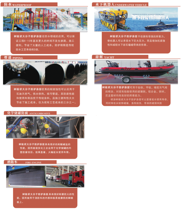 樹枝狀大分子防護涂料是一種經過特種高分子擴展鏈改性,具有100%固體分,快速固化和優異的物理化學性能特征的雙組分高性能特種涂料。具有環保無污染、防腐時間長、附著力強、耐磨損、抗沖擊、防水、絕緣、耐高壓、高阻燃、不變色褪色等諸多特點。