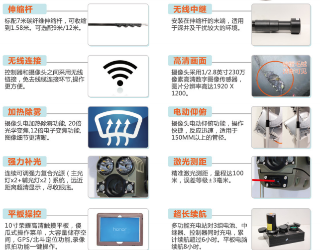 高清無線潛望鏡可用于快速檢測、診斷管道內部狀況,在檢測過程中,視頻將通過無線信號傳輸到手持式工業平板控制器上,可以方便地通過觸摸屏上的虛擬按鈕,控制機頭的俯仰,從而獲取管道缺陷位置處的清晰圖像; 同時可抓取、保存缺陷圖像,錄入文字、缺陷代碼,疊加顯示并保存到視頻中,并可形成打印文檔。