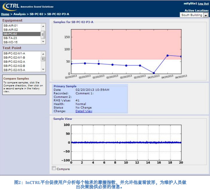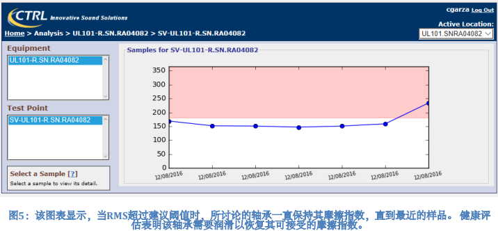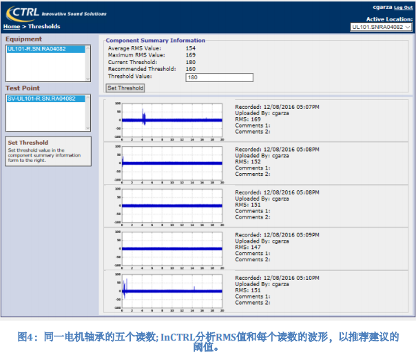 為了建立基線,CTRL Systems Inc.的InCTRL平臺要求用戶收集每個軸承的至少5個讀數。 該系統不僅分析RMS值,還分析每個讀數的波形,因為可以在波形中識別產生與潤滑有關的問題的影響,表明該特定軸承被懷疑即將發生故障。