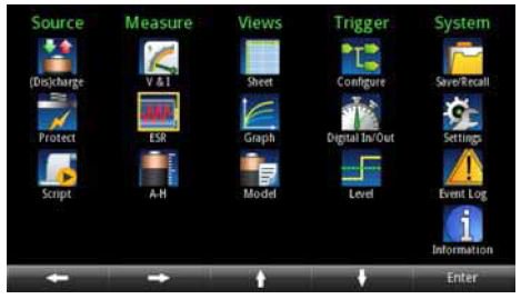 高亮度4.3 英寸TFT 顯示器用大的易讀字符顯示電壓、電流 和安時讀數、源設置及許多其他設置?;趫D標的主菜單提 供了用戶可以控制和設置的所有功能,可以快速進入源設置、 測量設置、顯示格式、觸發選項和系統設置。菜單簡短,所 有選項容易查找且描述清楚,可以使用導航輪、數字鍵盤或 軟鍵迅速設置測試參數。許多設置參數,如電壓和電流設置, 可以直接從主屏輸入;不復雜的測試無需進入主菜單進行設 置,就可以在主屏上使用軟菜單進行調節。不管測試要求簡 單還是復雜,Series 2281S 電源都為設置所有要求的參數提 供了一種簡便方式。