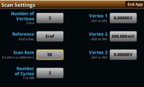 • 循環伏安法:在測量電流時,以用戶可編程的掃描速 率在 2至 4?個定義的頂點之間掃描電位。使用模擬積分方法測量電流。這個