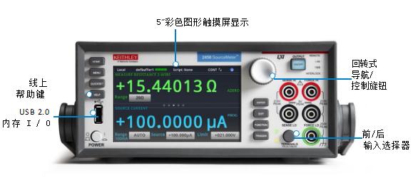 除 5?英寸彩色觸摸屏外,2450-EC?前面板還具有許多功能,可補充其速度,用戶友好性和易學性,包括 USB 2.0?存儲器 I / O?端口,幫助鍵,旋轉式導航/控制旋鈕,一個前/后輸入選擇器按鈕和一個用于基本臺式應用的香蕉插孔。USB 2.0?內存端口支持簡單的數據存儲,保存儀器配置,加載測試腳本和系統升級。另外,所有前面板按鈕都帶有背光,以增強在弱光環境下的可見性。