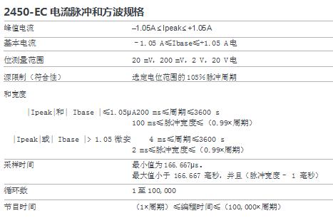• 電流脈沖和方波(帶電壓測量):2450-EC以可編程的峰值和基極電平提供電流,并以脈沖峰值電平記錄 產生的電勢。