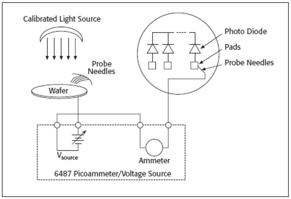 6487型皮安表/電壓源能配合校準光源與探針夾具使用以創建經濟有效的 光電二極管測試系統。多臺6487可以連接至DUT的探測墊以提供光電流讀數, 或者隨著增加開關矩陣,一臺皮安表就能從多個探測墊測量電流。測量過程的 第一步完全在黑暗中進行,6487生成一個電壓掃描,然后測量產生的暗電流。 在第二步中,隨著校準步驟中的亮度級增加,施加電壓偏置并測量產生的光電 流。相同的基本測試配置可用于測試正-本征-負(PIN)二極管和雪崩光電二極管 (APD)。6487在10V輸出量程的高分辨率在要求較小偏置時具有優秀的掃描和偏 置功能。500V的輸出能力是為APD提供偏壓所必需的。