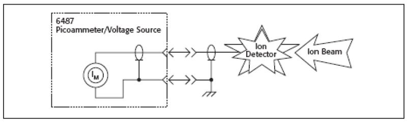 在半導體制造中,聚焦離子束系統常用于納米級成像、微加工和測圖。重要的是,用 離子檢測器仔細監測離子束電流的幅度。離子束產生的次生電流與主離子束的電流成比 例。當測量次生電流時,它能用于控制主離子束的強度。然而,次生電流非常微弱,通常只 有幾個皮安,因此測量儀表必需具有很高的測量準確度和可重復性,以及皮安級以下的 分辨率。6487的寬測量范圍和5位半分辨率使其非常適合于此應用。通過6487的三同軸連 接器實現6487的信號連接。通常,檢測器可能需要高電壓吸引離子,因而必需使用6487的 500V輸出。
