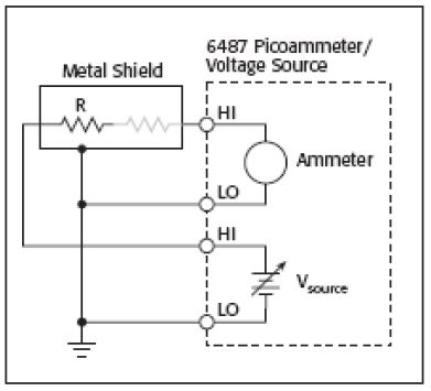 6487皮安表適合在絕緣電阻測試等應 用中測量高電阻(>1GΩ)。一個恒定的電壓 與未知電阻和皮安表串聯。皮安表的壓降可 以忽略,因此全部壓降出現在未知電阻上。 產生的電流被皮安表測量并且使用歐姆定律 (R=V/I)計算出電阻值。為了防止靜電干擾 產生的電流,未知電阻封裝在屏蔽測試裝置 中。如果未知電阻器具有較大寄生電容,可 以增加一個小的串聯電阻器以降低噪聲。
