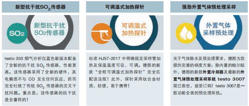 德圖 testo 350 藍(lán)色版配置的新型抗干擾 SO2 傳感器,可以準(zhǔn)確測(cè)量高濃度 CO 工況下的 SO2 濃度。