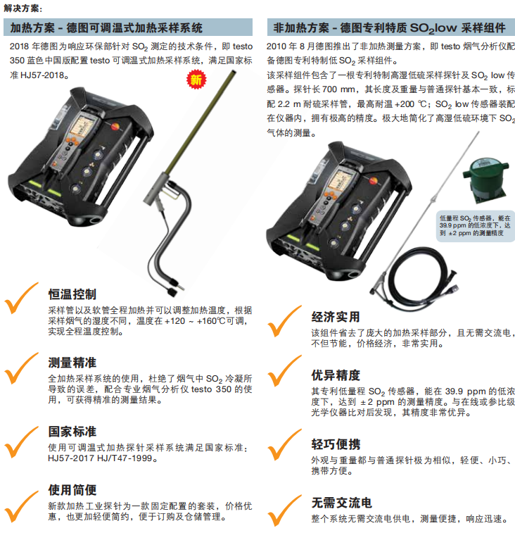 德圖專(zhuān)門(mén)開(kāi)發(fā)了低濃度SO2傳感器以及非加熱的高濕低硫探針和加熱型工業(yè)煙氣采樣探針,用于測(cè)量脫硫裝置中低濃度的SO2。為了進(jìn)行準(zhǔn)確的測(cè)量,可以將加熱型探針和非加熱型探針進(jìn)行配合使用。配有testo 350煙氣分析儀和帶有蠕動(dòng)泵的帕爾貼氣體調(diào)節(jié)裝置,用于自動(dòng)冷凝排水。可以完美測(cè)量在高濕低硫工況下的低濃度SO2測(cè)量。