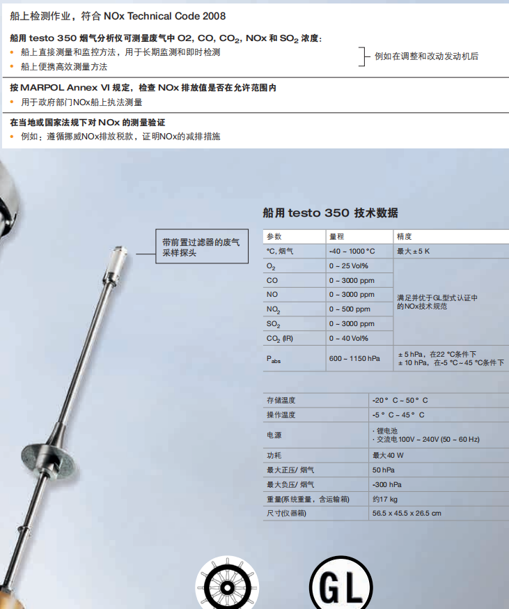 船用 testo 350 煙氣分析儀,是世界上第一款用于檢查船用柴油發(fā)動(dòng)機(jī)廢氣排放是否符合 MARPOL Annex 和 NOx Technical Code 2008 的便攜式排放分析儀。