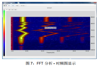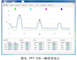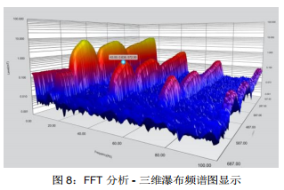 FFT 分析描述了信號幅度在頻率上的分布(如圖 6 所示)。三個軸向各自的頻譜以及全向的總值頻譜都可以顯示,通過選擇合適的“帶寬”(SPAN)可以顯示四種不同頻率范圍的頻譜。支持標記功能,兩個標記可用于簡化結果評估。也可以通過圖形顯示頻譜隨時間的變化,例如時頻圖(如圖 7 所示)或者三維瀑布圖(如圖 8 所示)