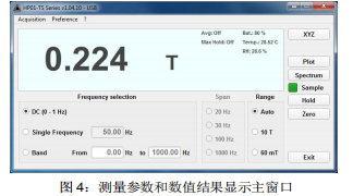 HP01-TS PC 軟件的圖形用戶界面設計非常人性化,使用非常方便。程序啟動后即進入操作主界面(圖 4 所示),一些主要的設置如測量范圍和頻率范圍都可以在主界面直接進行操作。顯示區域持續顯示磁通量密度測量的數值結果,如果需要也可以分別顯示三個軸向的測量值。點擊“調零”按鈕可以觸發調零功能,該功能可以將測量不確定度降到最低。為此,探頭頂端需要放入提供的零場強腔管內,以隔絕地球磁場或其他磁場的影響。三個不同的模式可以對靜態場(DC-1Hz)、任一單個頻率或頻率限定的頻帶積分的頻率范圍進行選擇。
