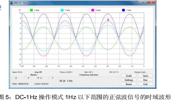 除了直接以數字顯示測量值以外,也可以使用圖形評估和顯示磁通量密度的時間響應。三個空間軸每一個軸向的 RMS 值和全向總值的時間響應都可以使用圖形顯示。恒定正弦波信號呈現為一條連續的水平線。在“DC – 1 Hz”模式,顯示的是瞬時值而不是 RMS 值,即一個正弦波信號也呈現為一個正弦波(如圖 5 所示)。這意味著即使低于 1Hz 的頻率分量的頻率和幅度也都可以顯示。