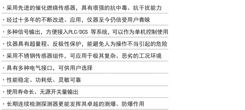 SP-1102 是一款隔爆型、固定安裝方式的可燃?xì)怏w檢測(cè)器,具有性能穩(wěn)定、功耗低、電源范圍寬、靈敏可靠、使用壽命長(zhǎng)、無(wú)源開(kāi)關(guān)量輸出等特點(diǎn)。該儀器可以長(zhǎng)期連續(xù)工作。因而被廣泛應(yīng)用于石油化工、化學(xué)工業(yè)、油田、油庫(kù)、液化汽站、污水站、環(huán)保、消防等領(lǐng)域及其它存在可燃性氣體泄漏的場(chǎng)所。在一些需要長(zhǎng)期連續(xù)檢測(cè)的危險(xiǎn)場(chǎng)所,該探測(cè)器更能發(fā)揮其卓越的測(cè)爆、防爆作用。