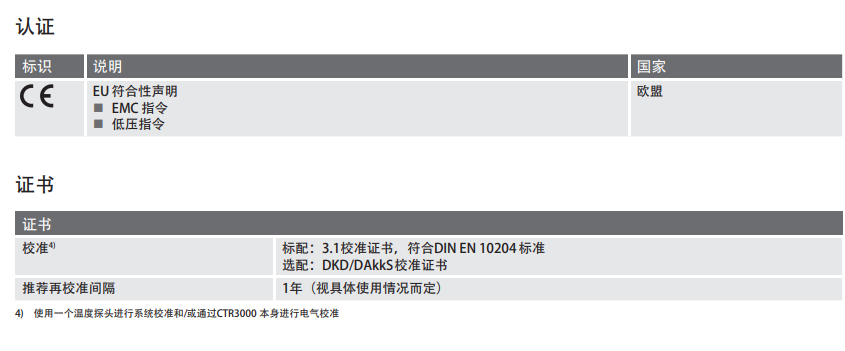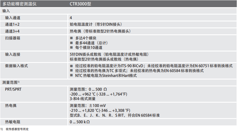 CTR3000 在使用時可選擇3線或4線(標準)鉑電阻溫度計(25Ω和100Ω)或標準鉑電阻溫度計,同時也可以匹配大多數的國際標準熱電偶和負溫系數熱敏電阻(NTC 熱 敏電阻)。溫度測量單位多樣可選擇,包括℃、℉、K。此外,基準的測量單位mV和Ω也將顯示在屏幕上。溫度值可通過對基準測量值換算得出。