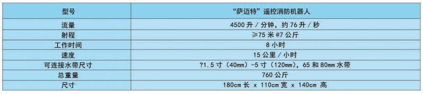 美國 “薩邁特”遙控消防機器人 相關參數: