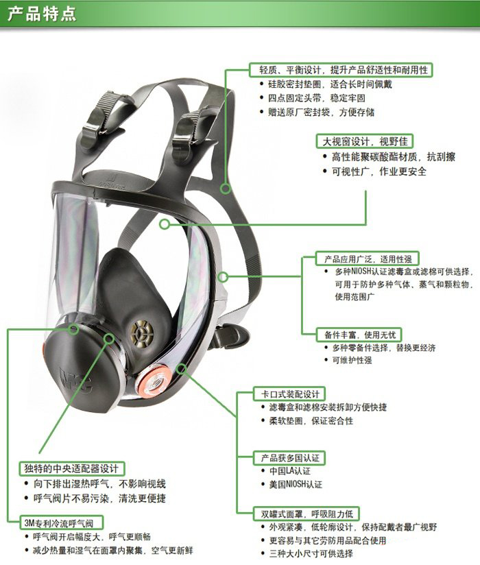 4.3M6800全面罩防毒面具適用于噴漆,涂料,制藥,化學處理,焊接等工作環境。