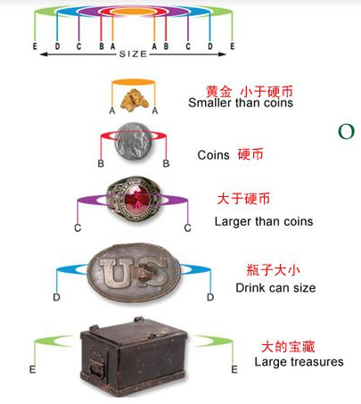 五個(gè)號(hào)都會(huì)顯示在顏色編碼的成像網(wǎng)格上,根據(jù)目標(biāo)在網(wǎng)格上的位置不同,目標(biāo)的深度也以兩英寸的級(jí)別遞增。探測(cè)器在工廠預(yù)設(shè)模式下,只有按住TREASURE IMAGING,目標(biāo)的尺寸與深度才會(huì)顯示出來(lái)。在圖像搜索狀態(tài)下,所有被探測(cè)器發(fā)現(xiàn)的物體的大小和深度都會(huì)顯示出來(lái)。