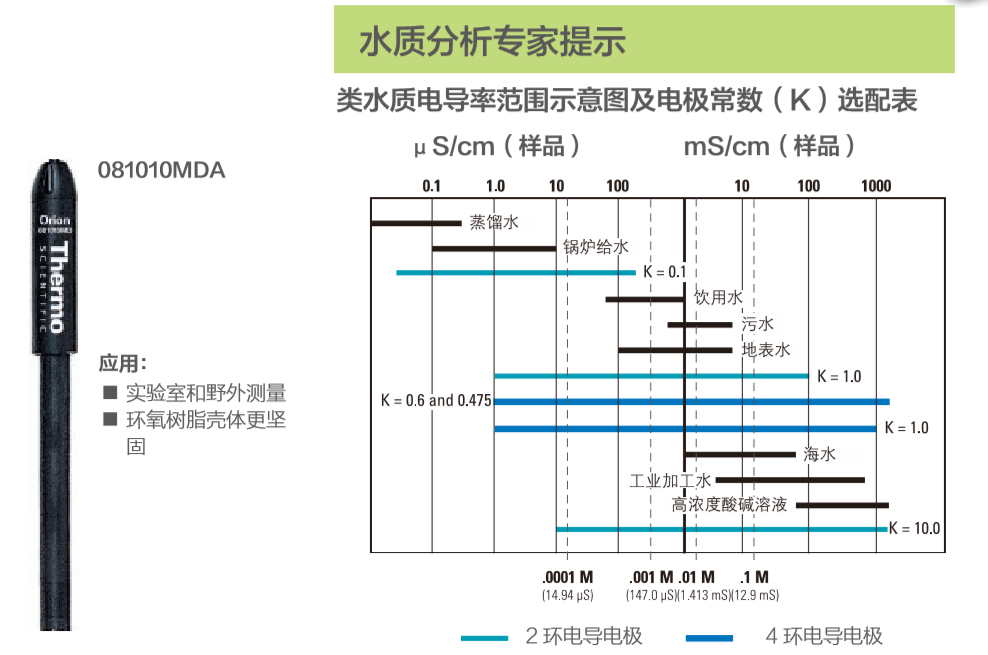 我們提供多種類多用途的電導電極,所有的電導電極 均自帶溫度補償探頭,分別適用于低、中、高量程電 導率的測量,電導池常數從0.1 到10 cm-1,電極材 料有環氧樹脂/ 石墨,玻璃/ 鉑金以及不銹鋼幾種。