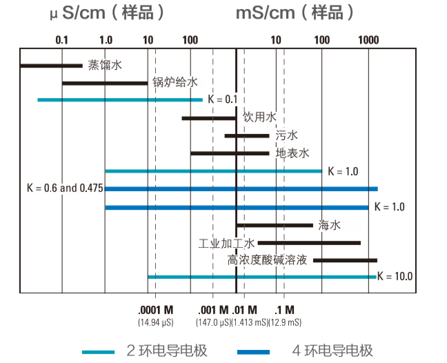 類水質(zhì)電導(dǎo)率范圍示意圖及電極常數(shù)(K)選配表